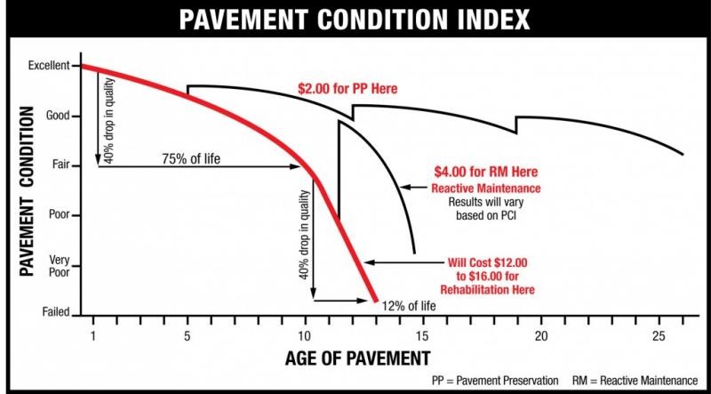 Civilians typically prefer all new pavement with new layers of either asphalt concrete or cement concrete. At the early stages of preservation treatment, pavement appears rough and messy until the treatments completely cure. To combat public outcry, engineers must continuously meet with civilians to educate them on the pavement preservation process. Engineers should demonstrate how reactive maintenance is more time-consuming and expensive, costing tax payers more money to fix damaged roads in the long run (see Figure 1).